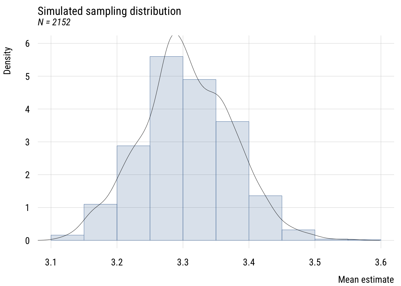 mutate(m = get_sample_mean(n = 2152)) # vary the NNow I can plot the results.