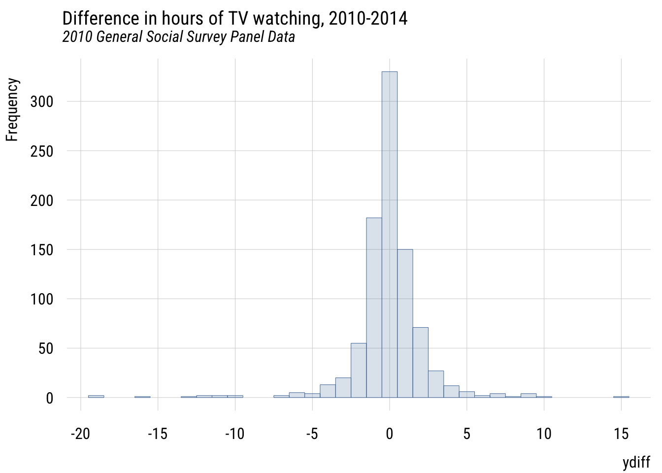 We are going to look at studying how US adults might have changed the number of TV hours they watch. This first chunk is just getting some GSS data and calculating each respondent’s difference in reported hours from 2010 to 2014.