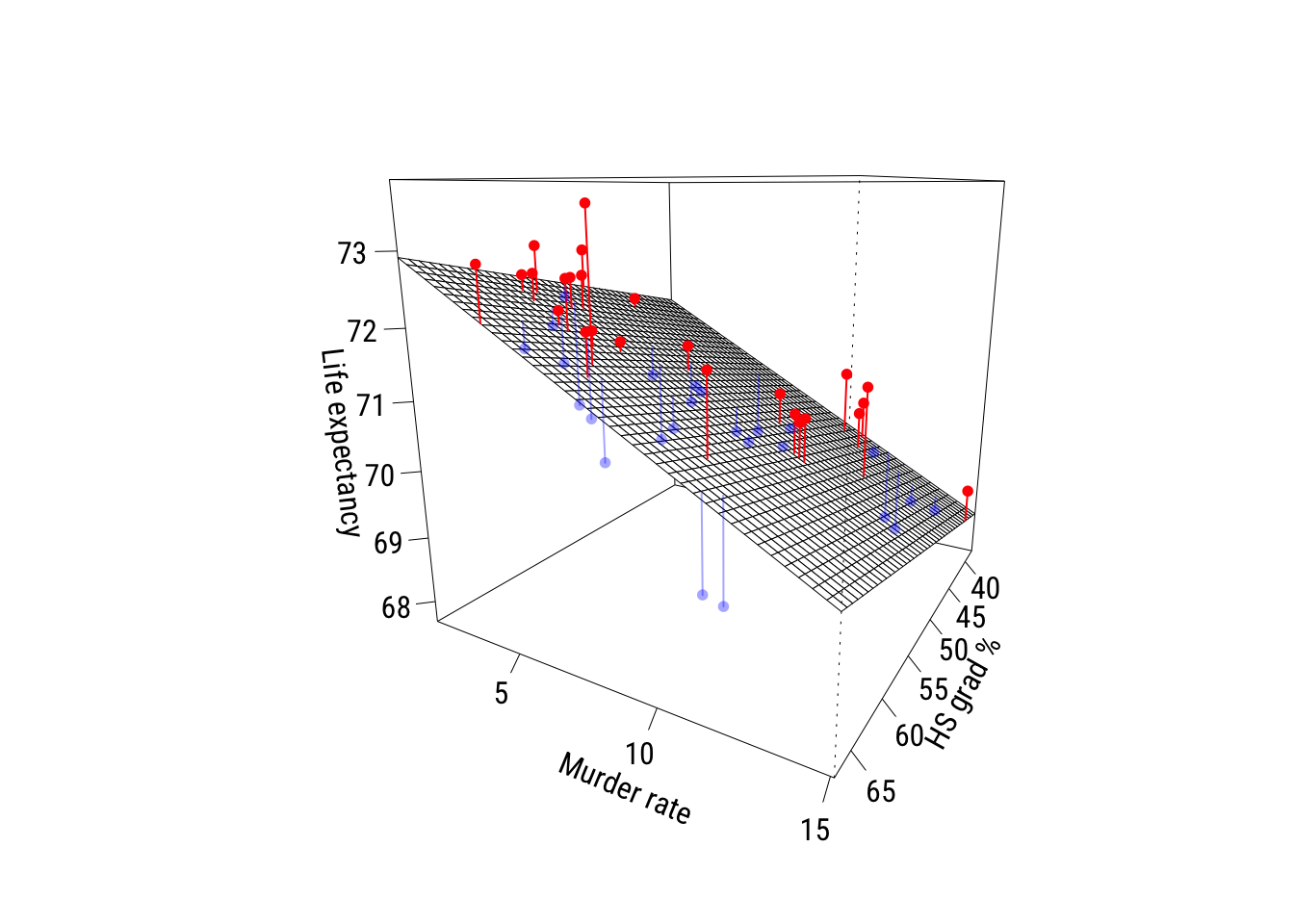 xlab = "HS grad %", ylab = "Murder rate", zlab = "Life expectancy",