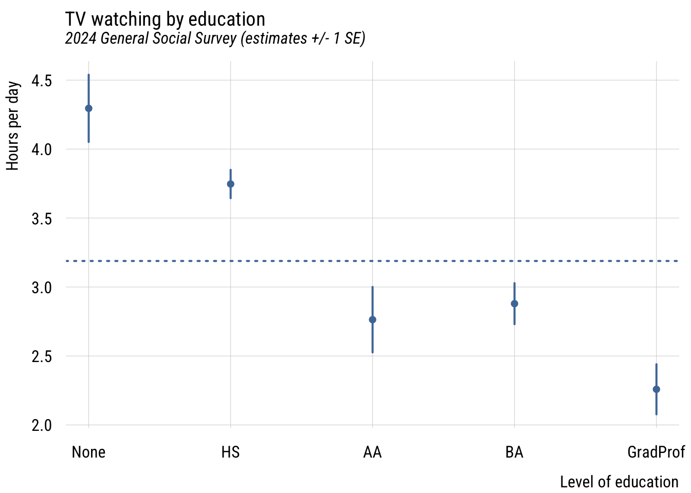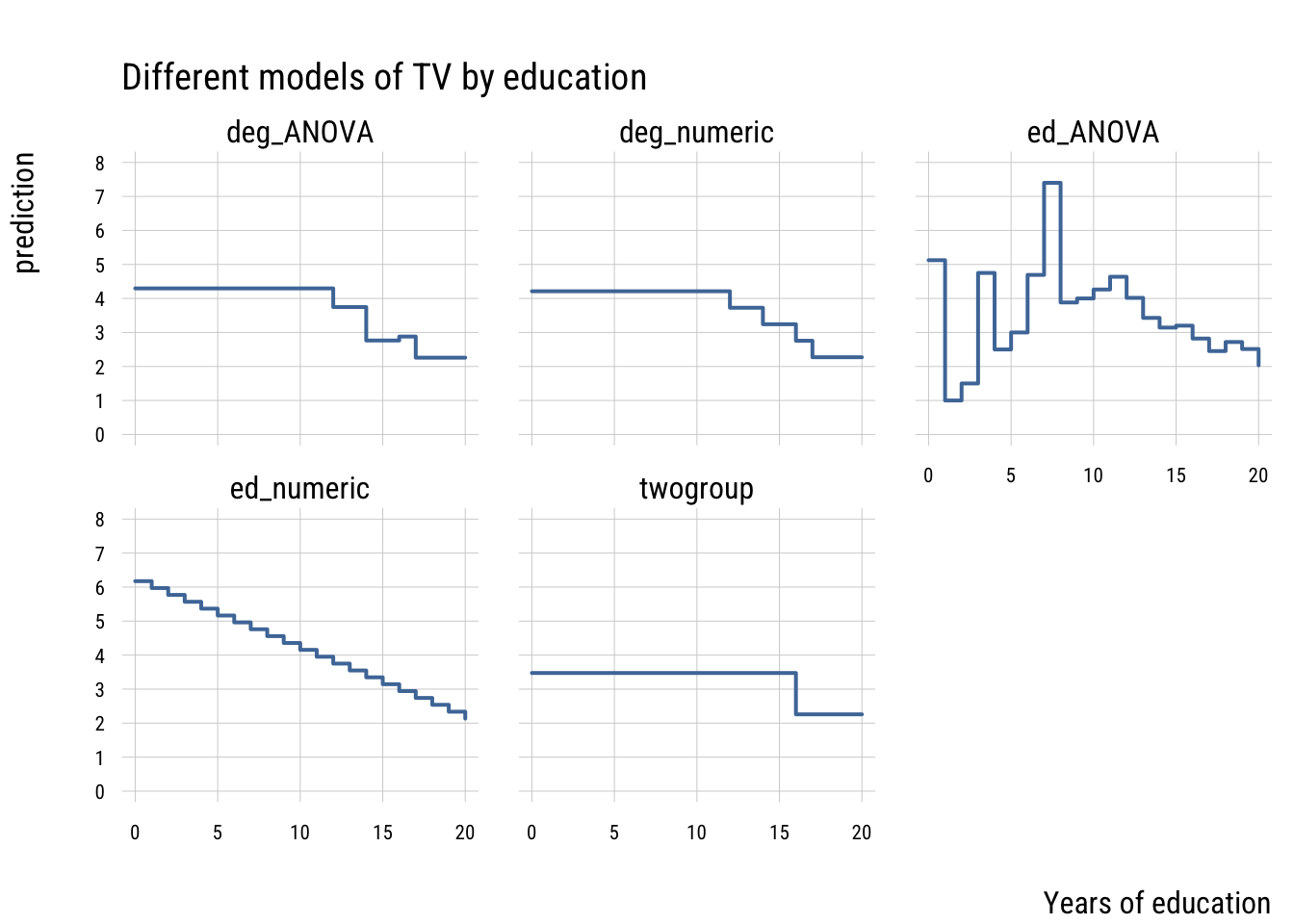 In the spirit of what we’ve done so far, let’s think of how to compare these models. Consider three options for modeling educational differences on TV watching:
