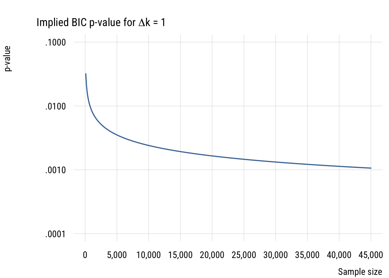 Finally, since right now we’re focused primarily on comparing models with only one parameter difference, let’s look at the implied p-value difference for such comparisons with different sample sizes.