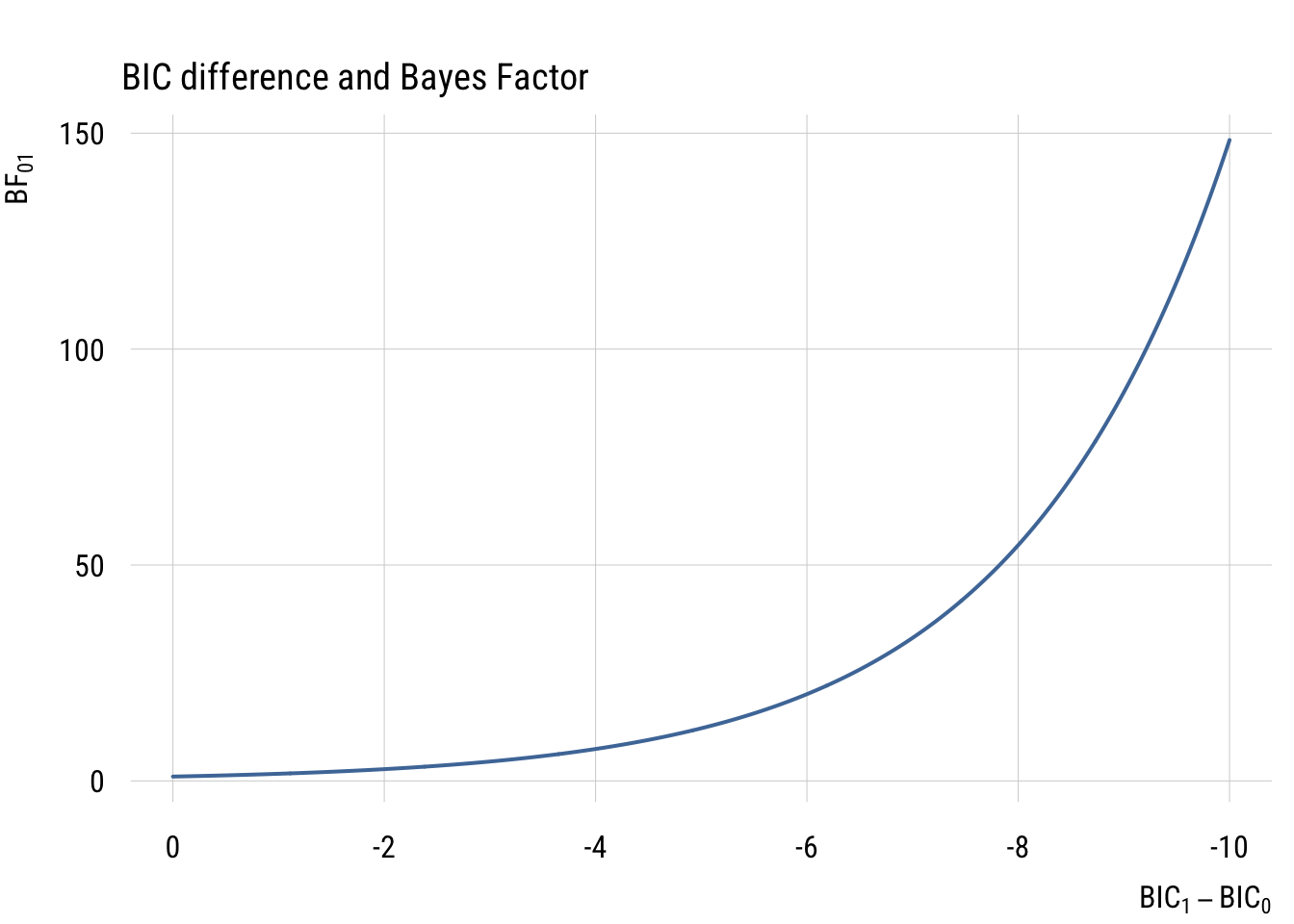Just to build your intution, here’s a graph showing the relationship between BIC difference and BF.