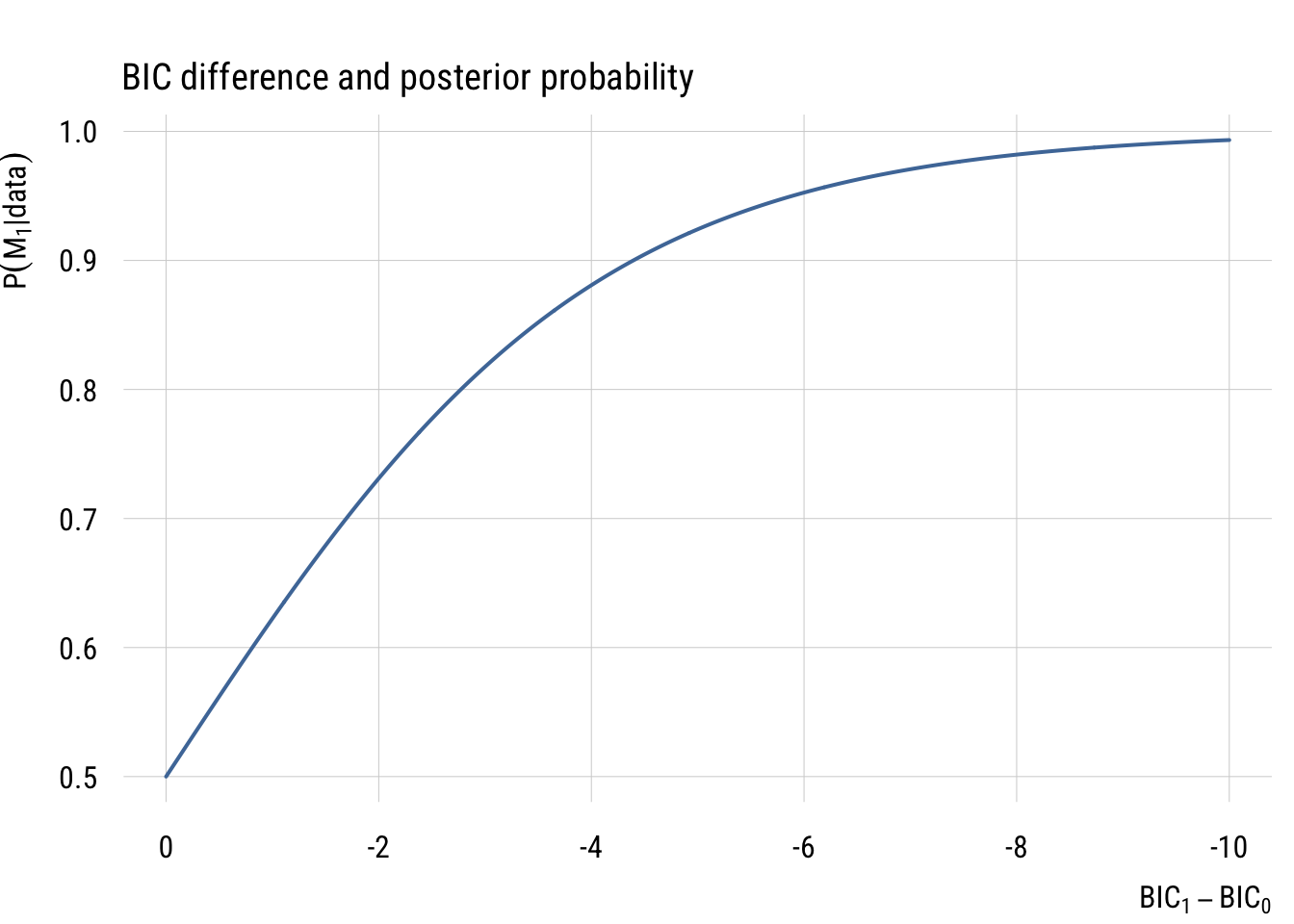 The graph below shows how BIC differences become posterior model probabilities.