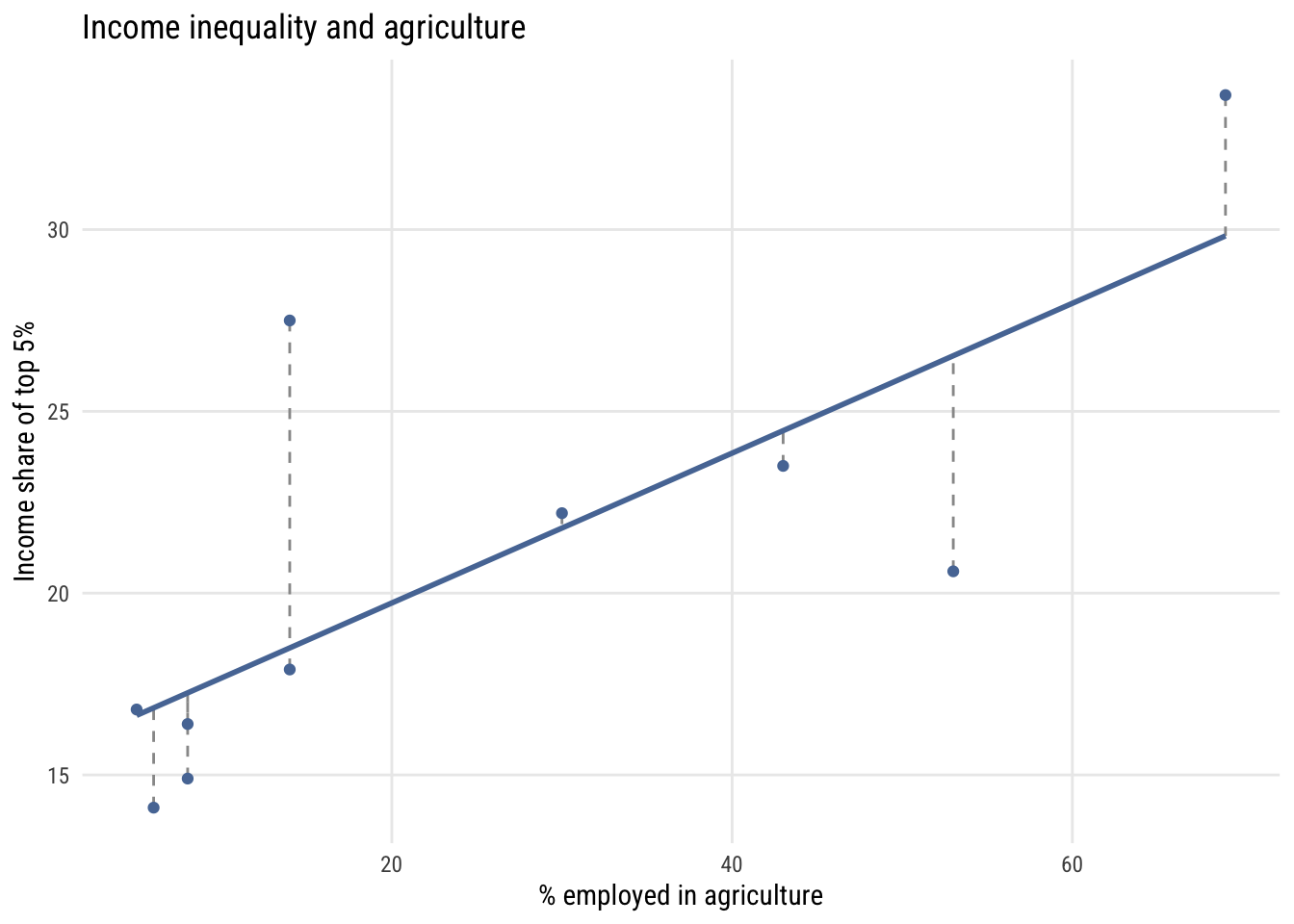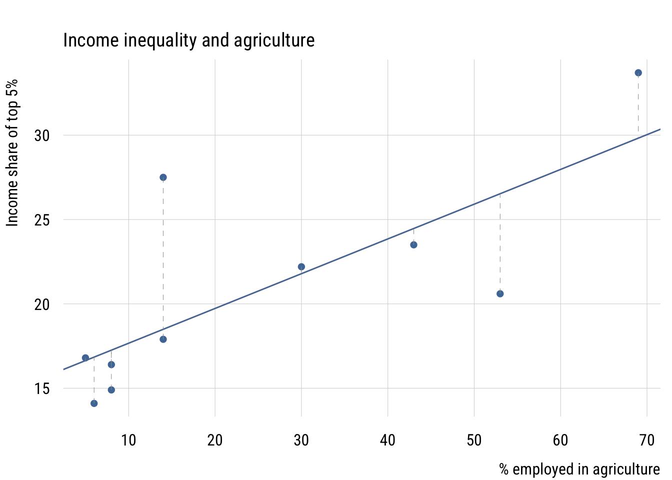 The error \(\varepsilon_i\) for each observation is the vertical distance between the observed \(y_i\) and the model’s prediction \(\hat{y}_i\). Here is what that looks like with a small dataset on income inequality and the share of employment in agriculture for 10 countries.1