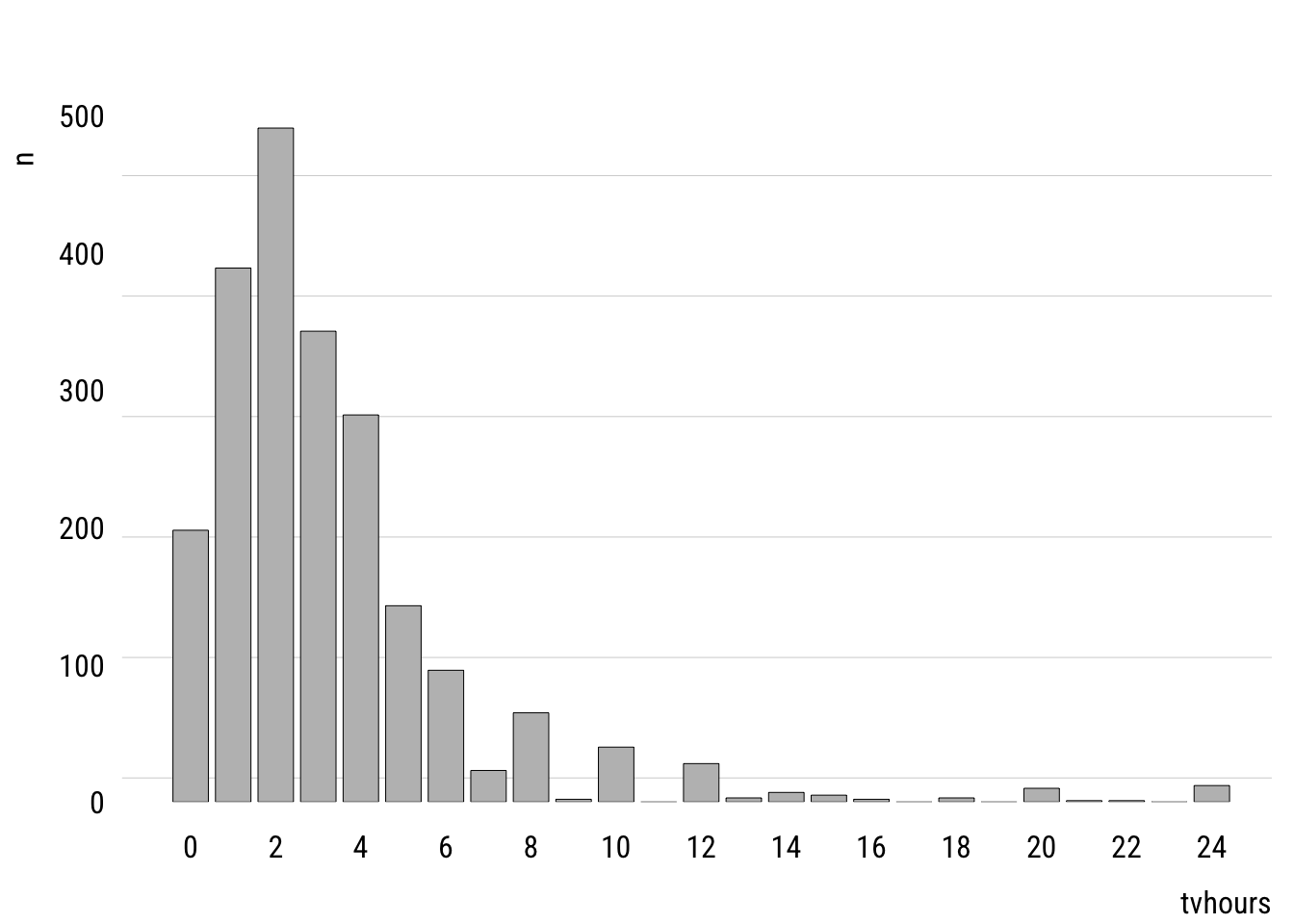 Before looking at predictors, we can think about how a variable could be modeled using the Poisson. First, let’s look at the unconditional distribution of tvhours in the GSS data.