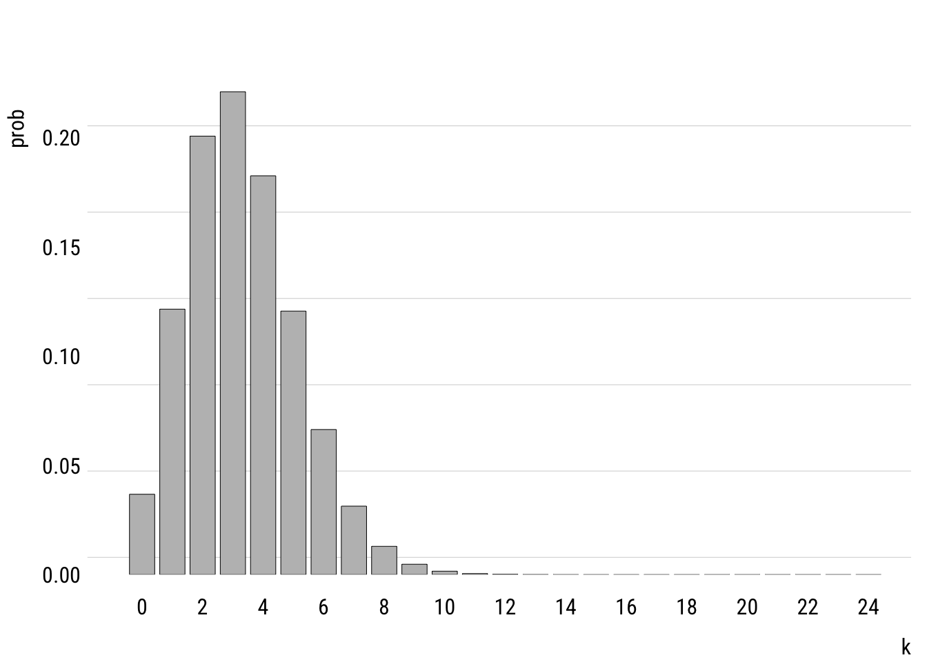 This shows the empirical distribution. The mean of tvhours is 3.3. A Poisson with \(\lambda =\) 3.3 looks like this.